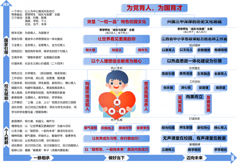 第二,结合三个层面的育人指引:充分结合“国家-学校-个人”三个层面的育人要求,由上而下(国家引领)、由下而上(个人躬耕),实现“国家引领-校长赋能-个人躬耕”三位一体的全面成长体系。