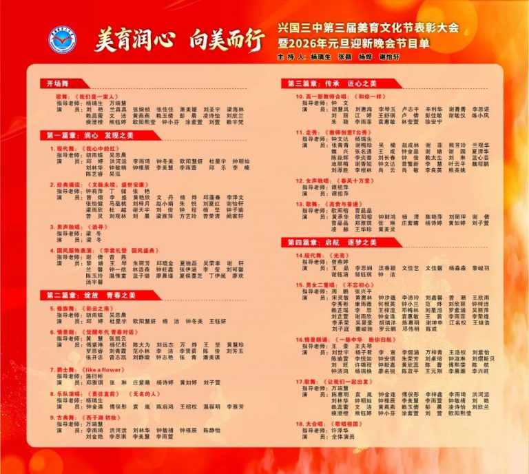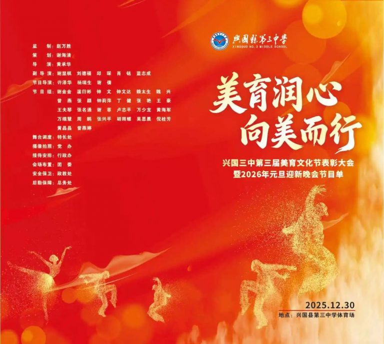 美育润心,滋养性灵;向美而行,照亮前程。今夜,我们以美育润心,以文化铸魂;明日,我们必将以更加饱满的姿态,向美而行,步履铿锵。兴国三中全体师生在2026年将继续并肩携手,以发现美的眼睛、创造美的双手、传播美的心灵,共同书写学校高质量发展的新篇章!
