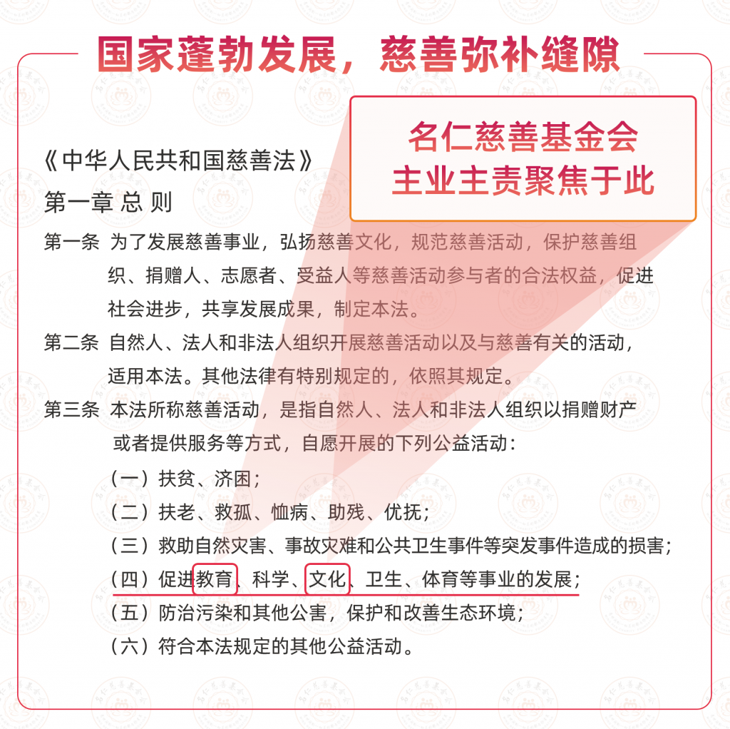 庆幸你我活在华夏,扎根于深厚的中国智慧(以儒、释、道三家为代表的中华优秀传统文化)与科学定律(如能量守恒、熵增与熵减、作用力与反作用力)的坚实根基之上。因此,广州市名仁慈善基金会坚定不移地选择促进“教育”与“文化”事业发展,致力于构建一套以“人”为核心的“成长与发展”体系,让每一个你我都能从中汲取力量,实现由内而外的蜕变,绽放生命独有的光彩,让世界看见更美的自己,便成为无限的可能。