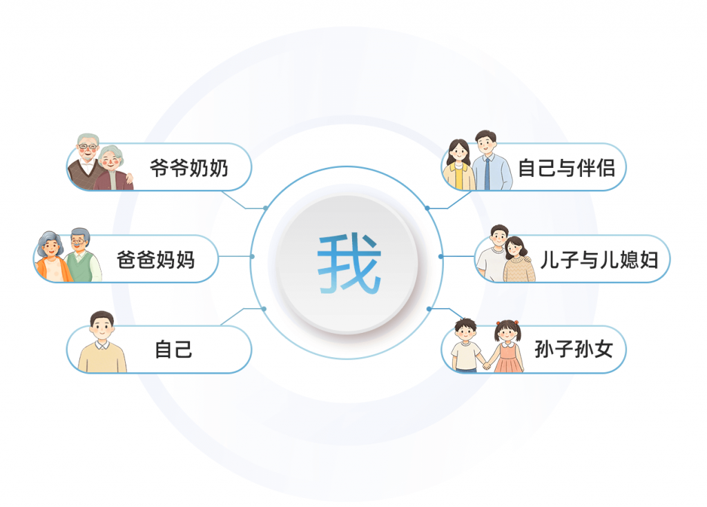 若用前三代的视角看就是:爷爷奶奶——爸爸妈妈——自己;若用后三代的视角看就是:自己与伴侣——儿子与儿媳妇——孙子孙女。由此可见,每一个“自己”都身居其中,处于承前启后的关键位置。