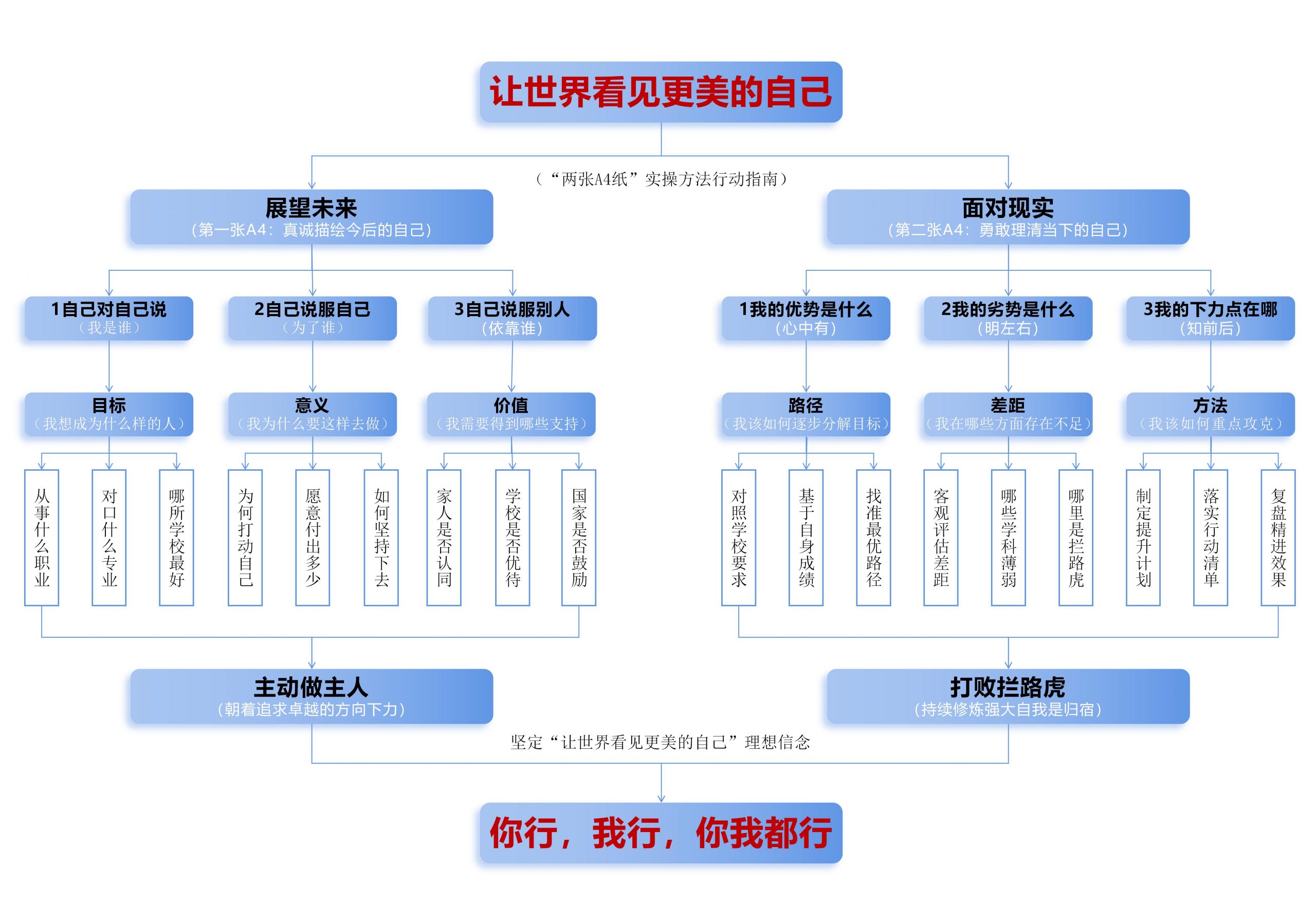 基于自身成绩、兴趣、优缺点,客观判断与目标之间的距离。勇敢承认“我现在还不够好”,这是变好的第一步。认真找准自己的路径、差距与方法: