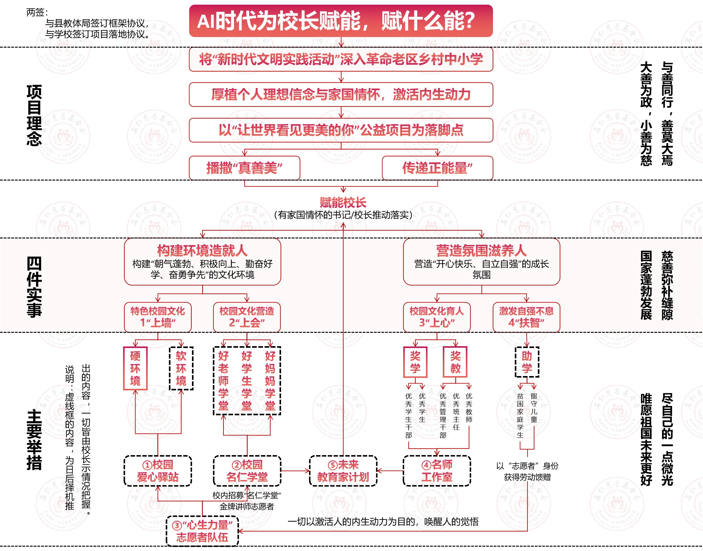 无论在人生的什么阶段,“成长与发展”始终是永恒的主题。生而为人一辈子追求的美好与幸福,也不过是活出自己想要的样子,让世界看见更美的自己。基金会发起人历经生死磨难后,追根溯源重新审视自己来时走过的路,通过“三拎清”潜心研究,在向内求的过程中,对人的本质有了更深刻的洞察、理解与判断,明白“做好自己才是一切的根本!”。为感恩回馈这一切,愿世间的一切美好都与你有关,名仁慈善始终致力于祖国新生代的起航,发起了“感恩回馈母校,重走‘长征路’再出发”公益活动,以“让世界看见更美的你”公益项目为落脚点,紧紧围绕“为党育人,为国育才”这一总目标,秉持“立德树人,教学相长,学学相长”这一规律,以老师和学生的“成长与发展”这一永恒主题,以此形成鲜明的“扶智助困”特色和“激活人的内生动力”的有效方法,通过“上墙、上会、上心”校园文化治校三步曲规划,尽心尽力尽情为祖国新生代做好一二三四件实事:
