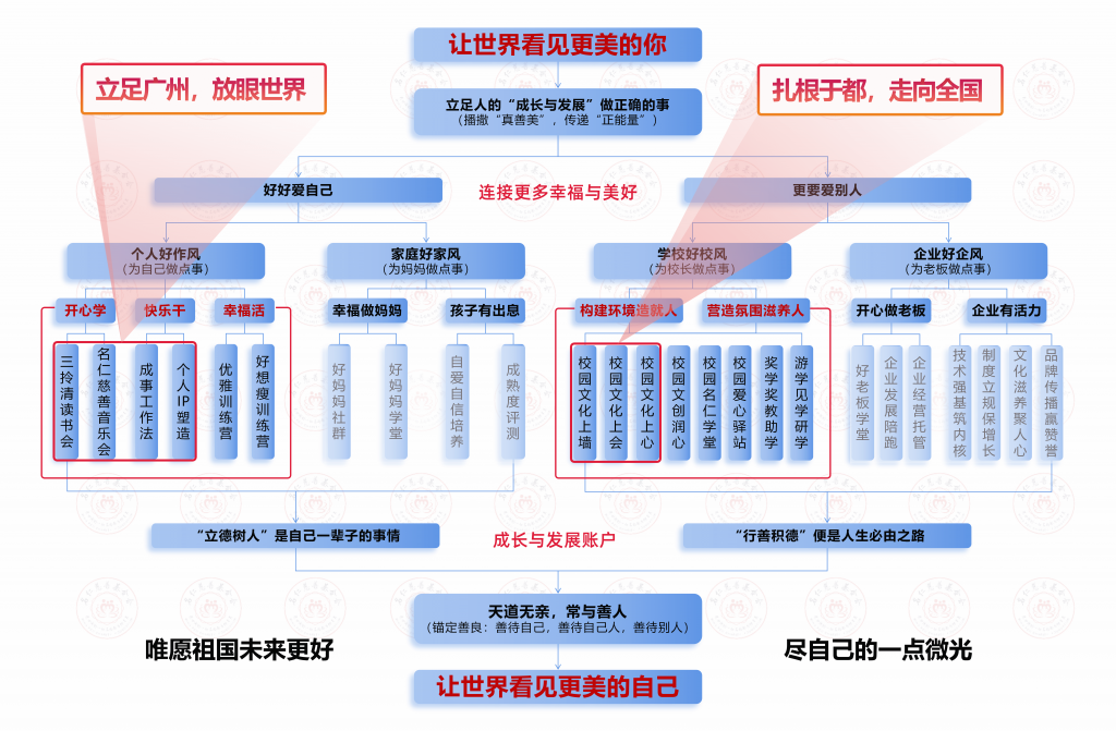 在行动实践上,基金会紧紧围绕“人”这一核心点下力,沿着“人-家-学校”与“人-家-企业”人生成长与发展的这一主线,抓住祖国新生代的关键引路人,切实引领人人从自己做起,用“好好爱自己”与“更要爱别人”的双向奔赴——由己及人、由家到校、由校到企,脚踏实地、躬身践行个人好作风、家庭好家风、学校好校风、企业好企风,方可助力更多人成长与发展,进而从容优雅地活着,连接更多幸福与美好。